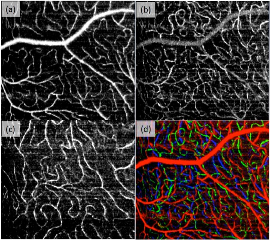 High resolution OMAG retinal vasculature network images reveal clear details of the vessel interconnections, particularly for the capillary blood vessels. (a), (b) and (c) present the blood vessel networks located at the GCL, IPL and OPL layers, respectively. (d) is the false color depth-encoded blood vessel images by combining together the vessels presented in (a), (b) and (c). The red, green and blue are corresponding to GCL, IPL and OPL respectively.