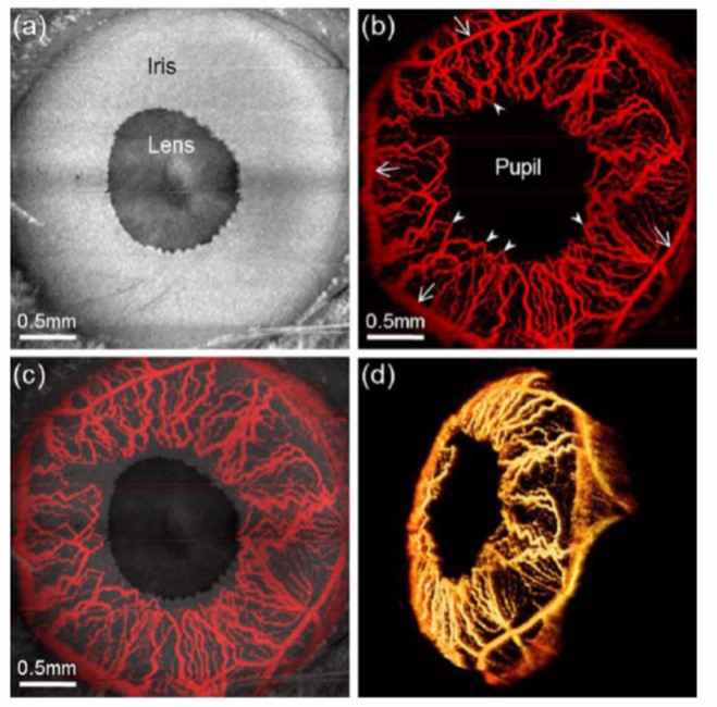 In vivo OCT microangiography of anterior eye in a healthy C57BL/6 mouse. (a) Maximum intensity projection (MIP) view [3 mmX × 3 mmY] of the 3D OCT images and (b) corresponding microvascular MIP image. (c) Overlaid image of (a) and (b). (d) 3D rendered iris vasculature (Media 1).