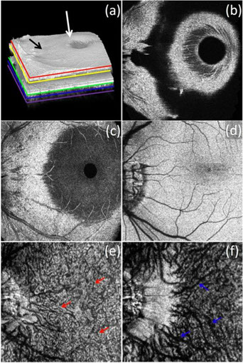 Ultrahigh speed SDOCT (500,000 A-scans per second) provides ability for comprehensive assessment of the retina status over a large field view. (a) 3D rendered volumetric image. (b) to (f) are typical depth resolved fundus (en-face) images, which are corresponding to the depth positions marked by the red, yellow, green, blue and purple lines in (a).