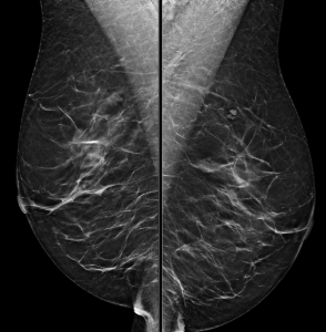 Explanation: One of the first steps in interpreting a mammogram is assessing the breast composition, also known as breast density. There are four acceptable categories described in the BI-RADS manual, which are listed above. Breast density is a subjective assessment of how much fibroglandular tissue compared to fat tissue is present in the breast, and also has a correlation to how difficult it may be to interpret a patient’s mammogram. Woman who have “dense” breasts (heterogeneously or extremely dense) have a slightly increased risk of developing breast cancer compared to women with non-dense breasts. This patient’s breasts were reported as being composed of scattered areas of fibroglandular density. Since this is a subjective determination, describing them as heterogeneously dense could also be acceptable.