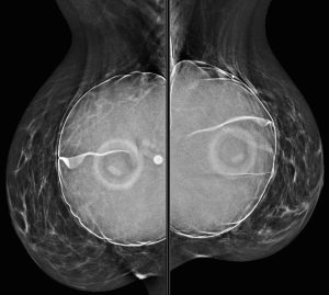 Explanation: These implants are filled with saline. Note the “see through” density of the saline, compared to the extremely dense silicone implant that was demonstrated in a previous case. We can also see the implant valves and mild rippling of the external implant contour, which are features typically associated with saline implants.