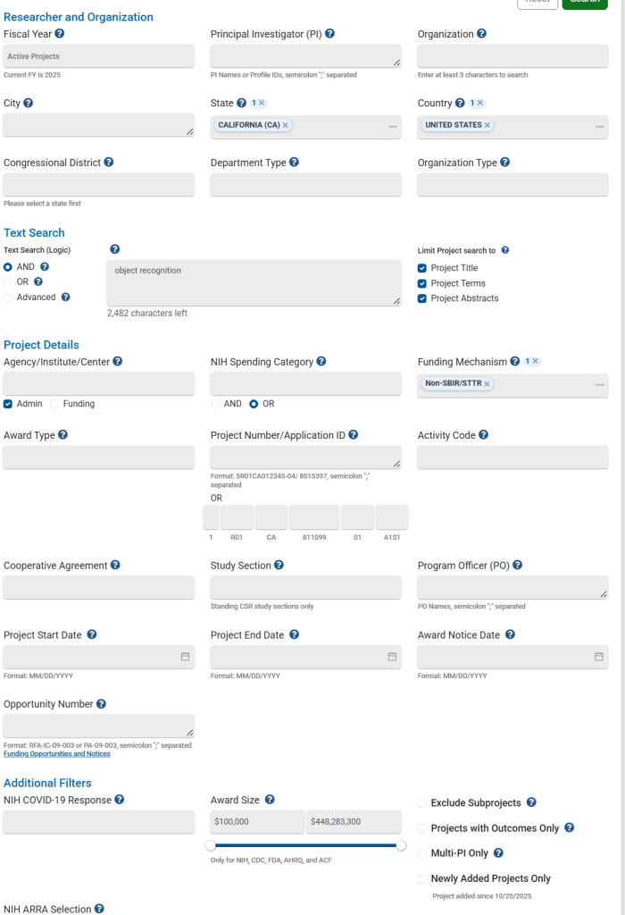 2. You can select a State (optional), one or two keywords, non-SBIR/STTR. Limit grants to those above 150K annually. Grants smaller than that are generally supporting an individual postdoc.