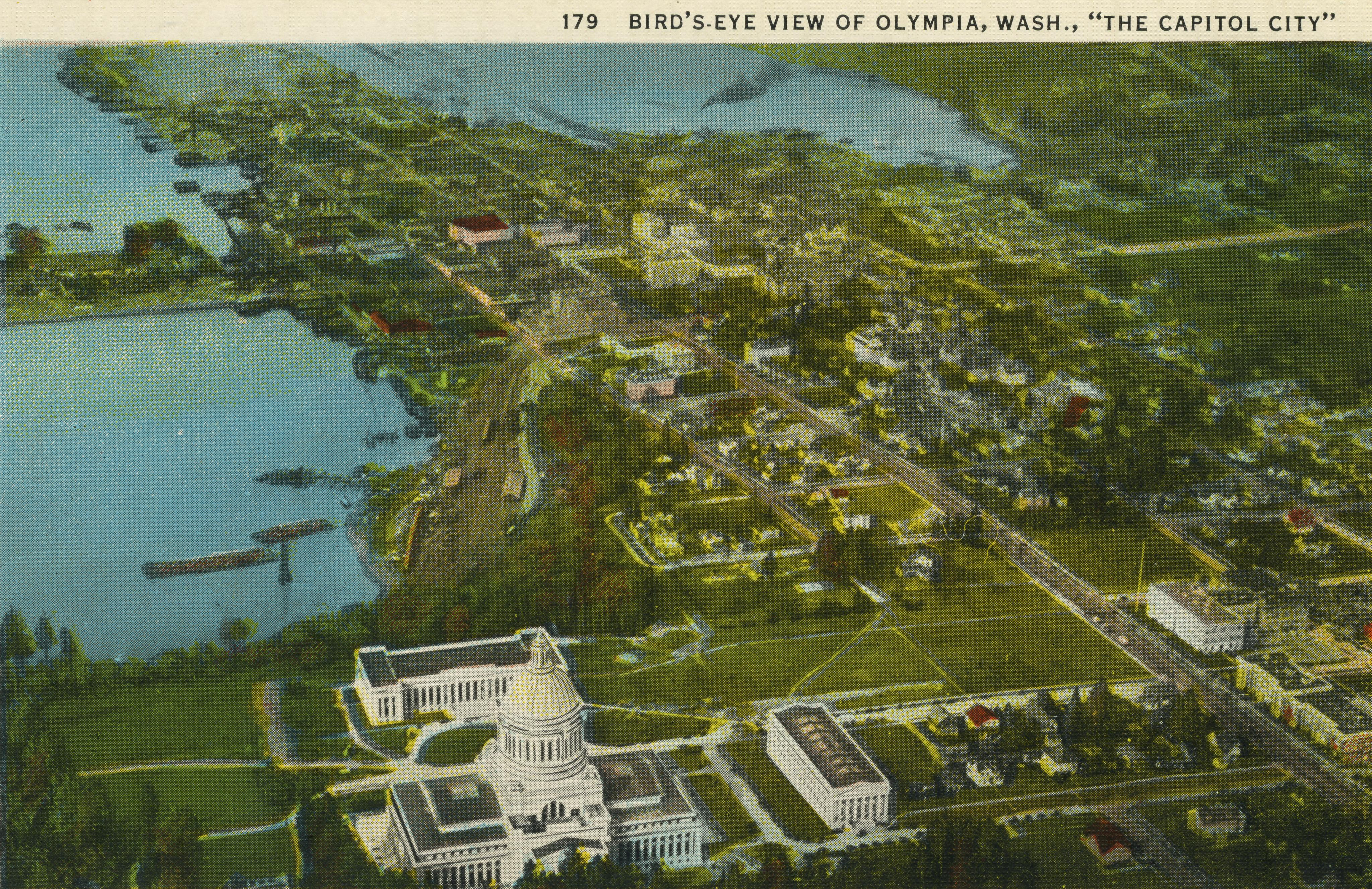 1927 postcard view of new Capitol and Olympia (courtesy: Washington State Archives)
