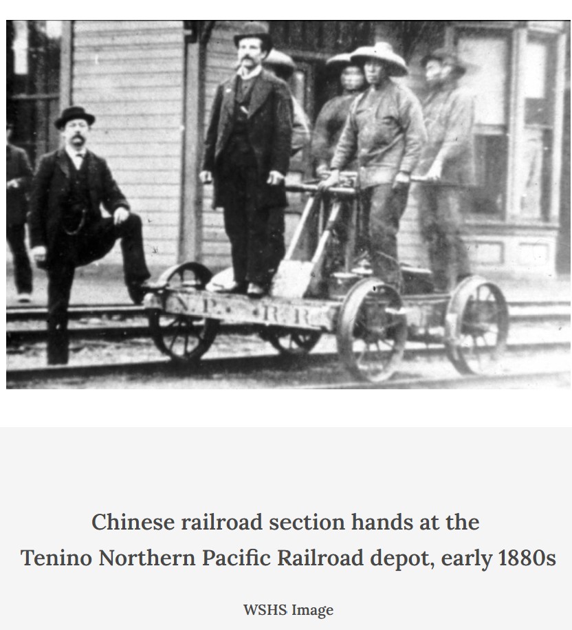 Courtesy Washington State Historical Society and Olympia Historical Society Despite the fact that George Bush and his family had found a home in what became Thurston County, later newcomers who were not White faced violence and exclusion. In small numbers, immigrants from China arrived in the county. Builders of railroad lines in 1870s employed Chinese workers who joined a few Chinese who had earlier found employment or established businesses in Olympia. A vicious anti-Chinese movement surged up and down the West Coast following the great Depression of the 1870s and the nationwide railroad strike of 1877. In 1882 Congress passed the Chinese Exclusion Act, blocking future immigration from that country, but nativists were also determined to drive out Chinese people already in the US. White mobs, sometimes led by the Knights of Labor, attacked Chinese residents of mining towns, railroad and lumber camps, and then cities. In late 1885, the violence reached Tacoma, where a mob of White vigilantes, including the mayor, set fire to Chinese neighborhoods and drove out all Chinese residents. The "Tacoma method” was repeated in Seattle three months later, and the city was put under martial law.