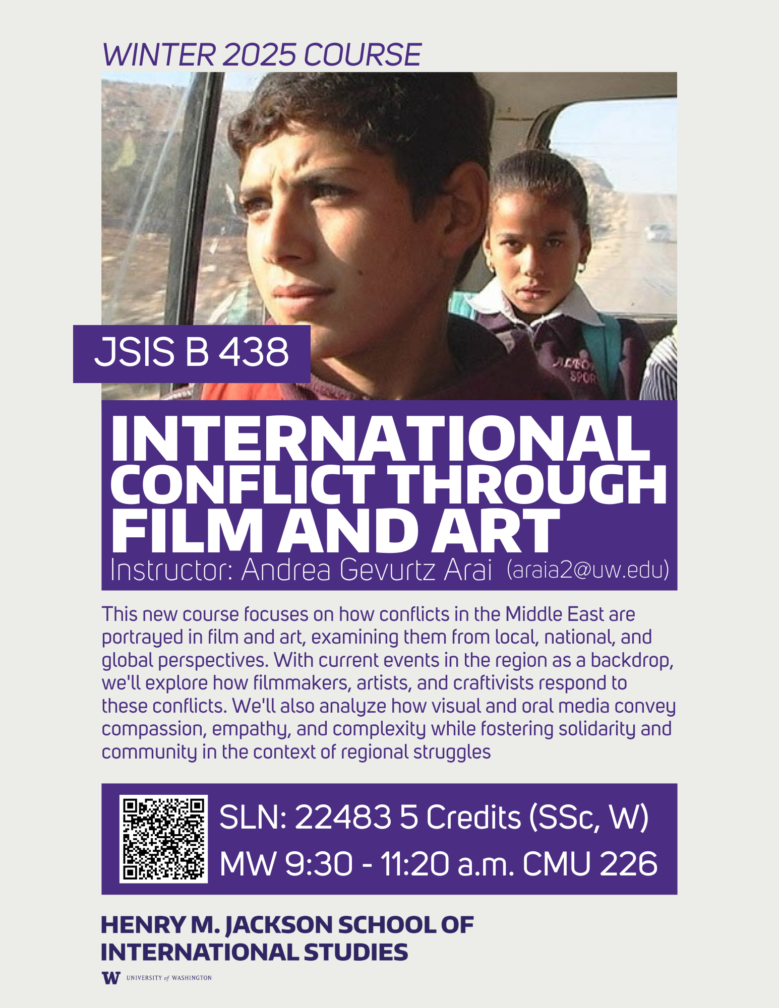 This year, the course focuses on how conflicts in the Middle East (specifically Palestine and Israel, this year) are portrayed in film and art, examining them from local, national, and global perspectives. With current events in the region as a backdrop, we’ll explore how filmmakers, artists, and craftivists respond to these conflicts. We’ll also analyze how visual and oral media convey compassion, empathy, and complexity while fostering solidarity and community in the context of regional struggles. – Instructor: Andrea Arai– Email araia2@uw.edu