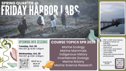 Each info session will cover what it’s like to be a student at FHL, the application process, and offered courses for Spring 2026. Courses offered are 300-400 level and cover the following topics: marine ecology, marine mammals, indigenous history, invertebrate zoology, marine botany, professional portfolio development, and marine science research