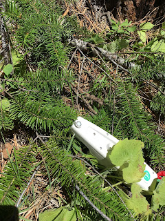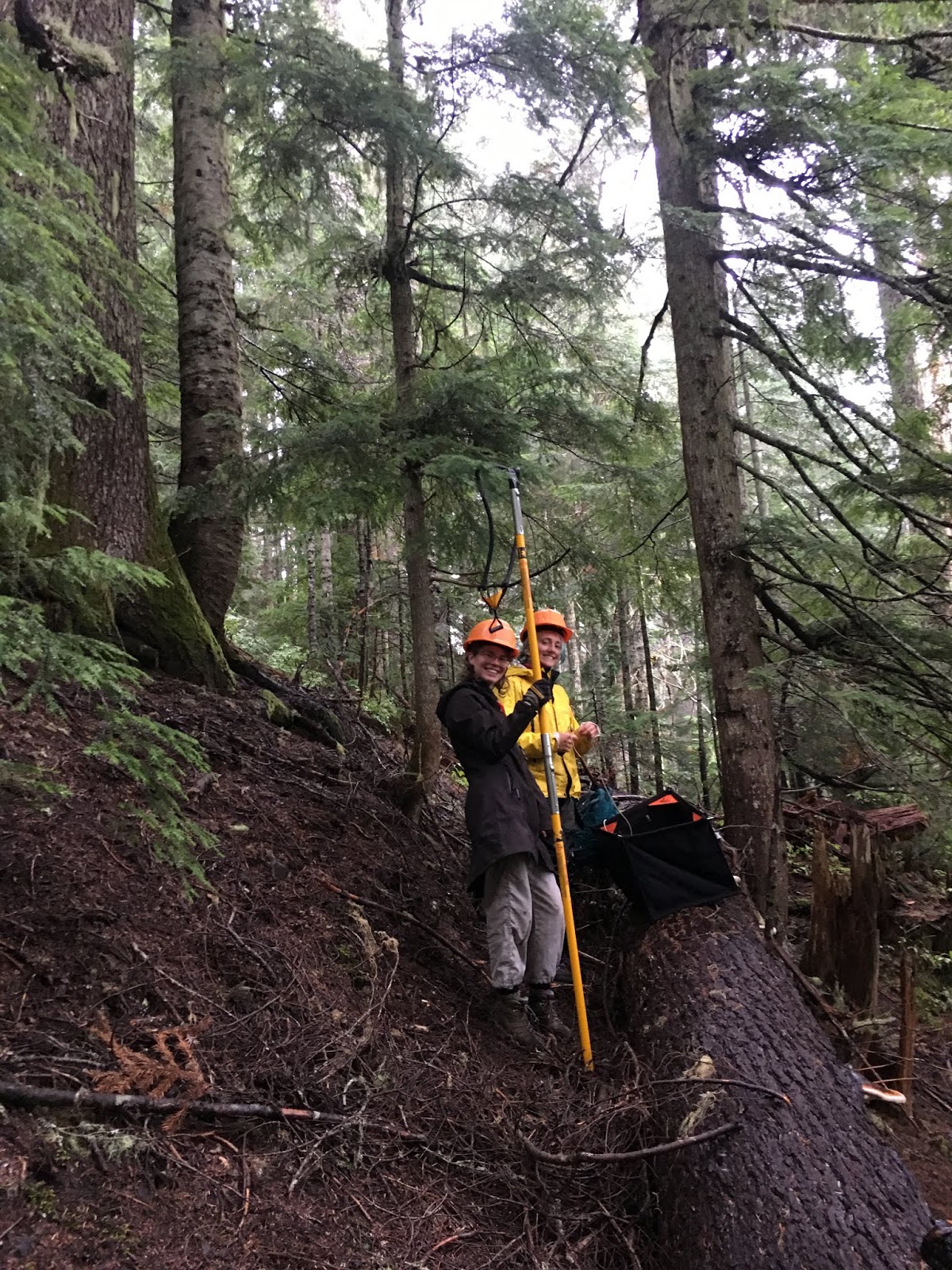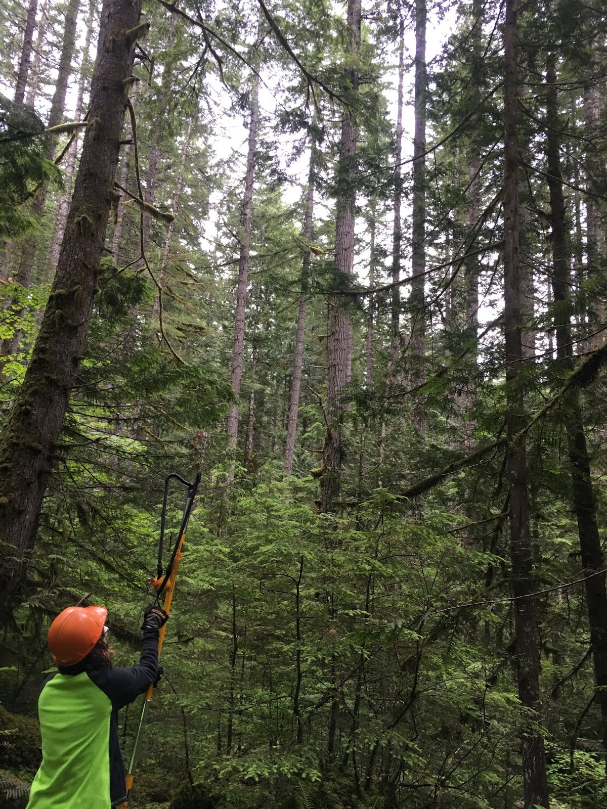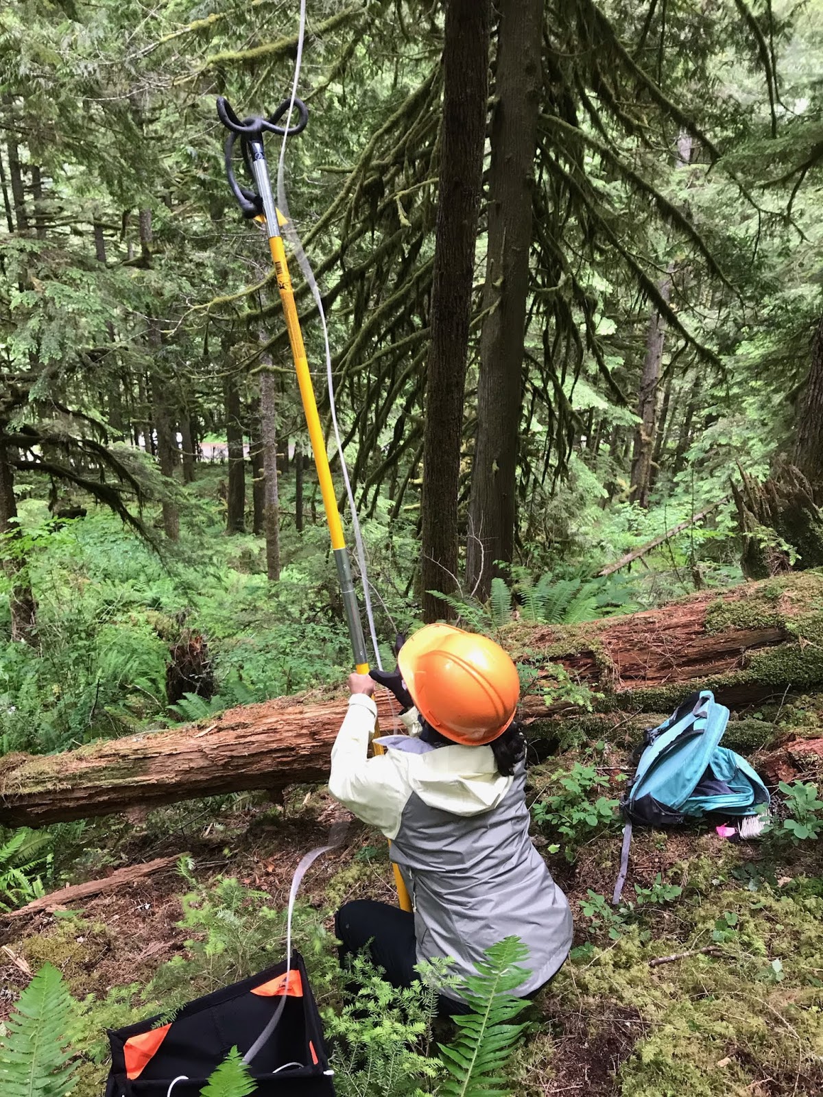 Turns out if you are interested in conifer photosynthetic traits, you need to get your hands on conifer needles that are pretty high up on the tree (where needles have sufficient sun exposure and are photosynthetically active). While I could have learned to climb trees (a dangerous skill to learn so quickly) or learned to use a shotgun (seriously, some researchers do shoot trees to get their leaves), I instead chose to invest my time and energy into a giant slingshot (officially referred to as an arborist’s throwline launcher, but calling it a giant sling shot is so much more fun!) and saw the branches down. And after lots of trial and error and some more error, it worked! As an added bonus, sling-shooting a 16oz weight at a tree branch about 35-40 ft high and then successfully sawing the branch off was incredibly empowering.