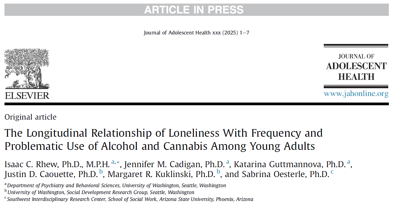 Rhew, I. C., Cadigan, J. M., Guttmannova, K., Caouette, J. D., Kuklinski, M. R., & Oesterle, S. (2025). The longitudinal relationship of loneliness with frequency and problematic use of alcohol and cannabis among young adults. Journal of Adolescent Health. Advance online publication. https://doi.org/10.1016/j.jadohealth.2025.06.037